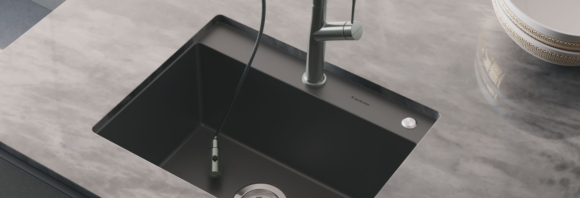 Disponível nas cores preta e branca e acabamento em 80% quartzo garantindo maior resistência e durabilidade e ainda 20% resina garantindo resistência ao calor, com instalação undermount.