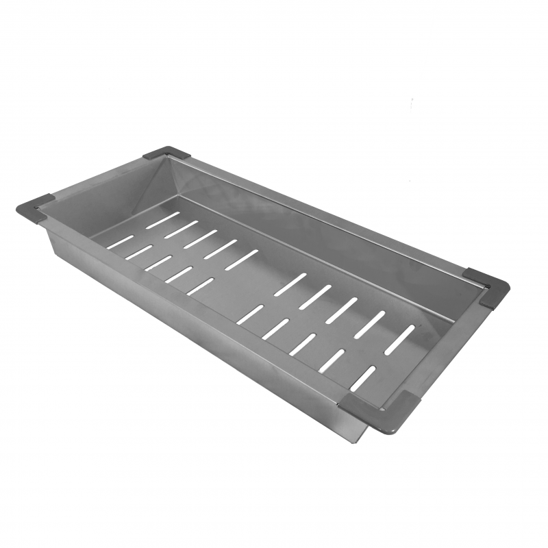ESCORREDOR PROFUNDO. COM BORDAS DE SILICONE. ACABAMENTO AÇO ESCOVADO. TAMANHO: 43 CM X 20,5 CM X 5 CM.