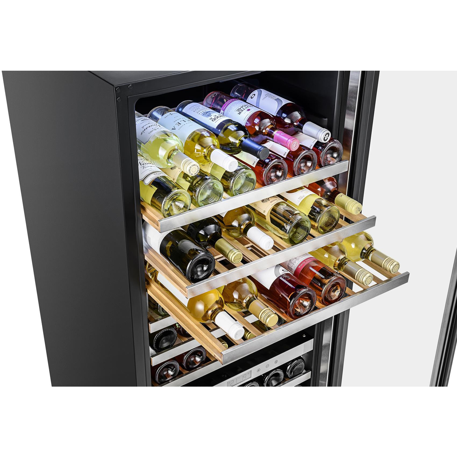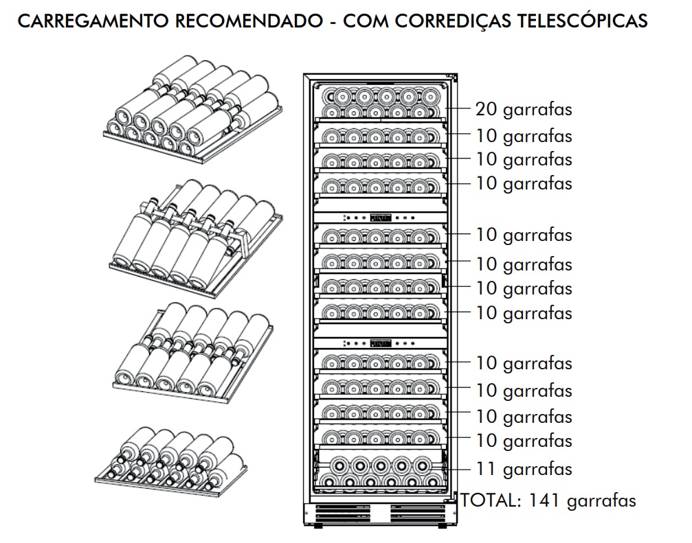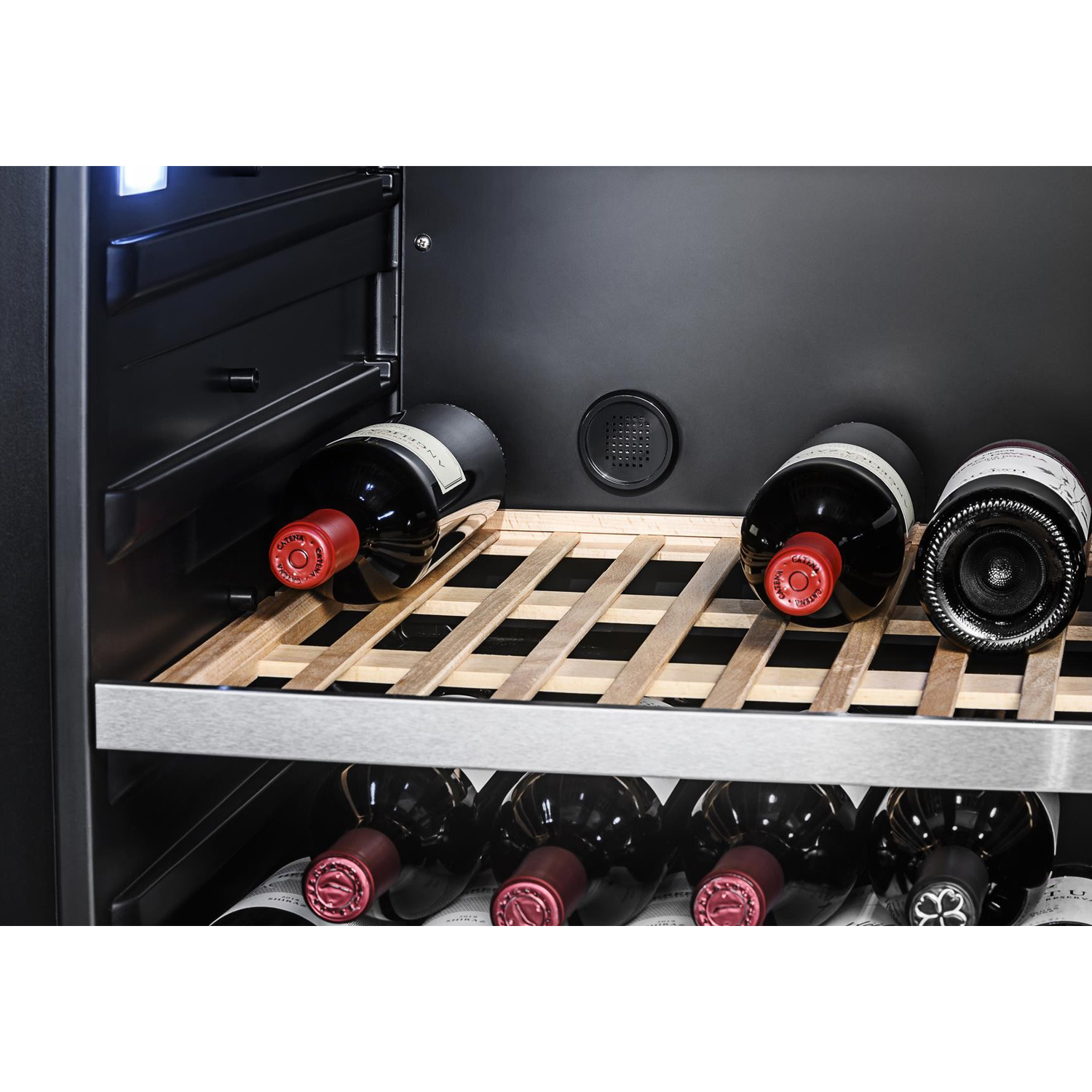 As 14 prateleiras extraíveis em elegante madeira maciça com tratamento anti-umidade e frentes em inox tornam mais fácil e agradável a seleção dos vinhos.