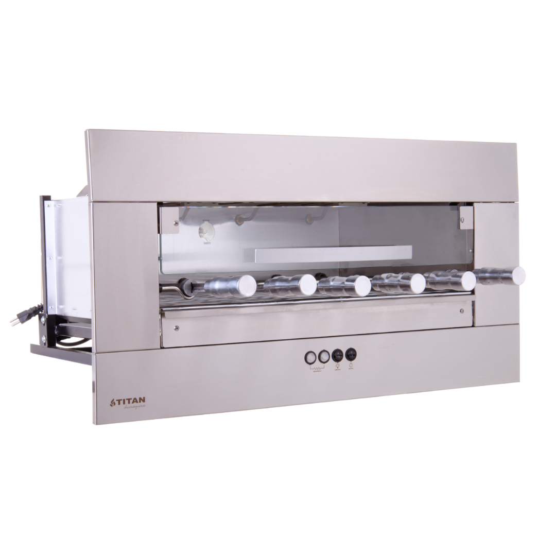 Churrasqueira a gás Titan para EMBUTIR em nicho de alvenaria, seu espaço gourmet mais moderno e prático. É ideal para assar Carnes, Legumes, Pizzas e garantir um saboroso Churrasco. Possui sistema rotativo, iluminação interna e duas resistências elétricas. Churrasqueira silenciosa e não produz fumaça.
