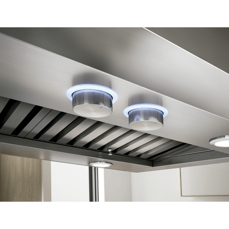 Sua eficiente capacidade de sucção de 2.000 m³/h com dois motores possui um funcionamento muito silencioso de 38 dB a 65 dB que proporciona grande conforto acústico ao ser utilizada, indispensável para cozinhas integradas a outros ambientes.