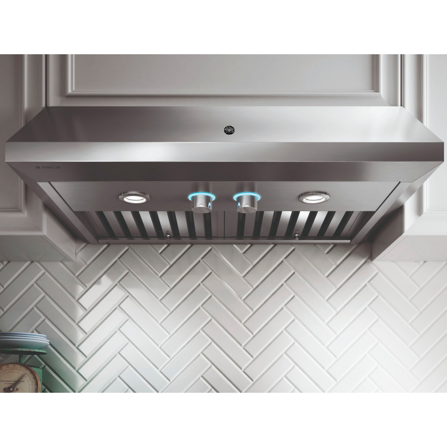 Toda em aço inox não poroso sem cantos vivos com elevada resistência à corrosão e manchas, que proporciona uma elegante aparência à coifa por muito mais tempo.