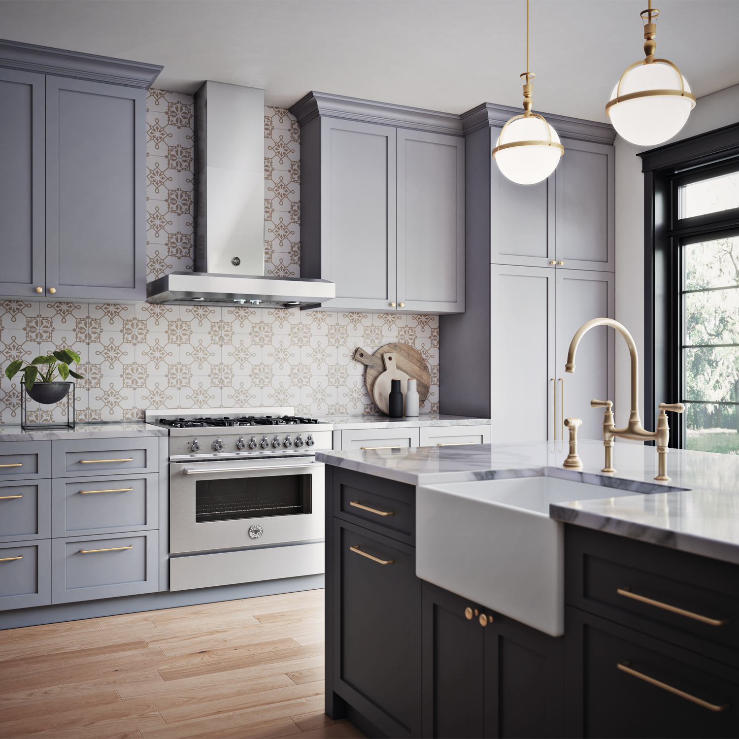 A coifa de parede BER Vavano 91 compõe elegantes conjuntos com os fogões, rangetops e cooktops Bertazzoni das linhas Professional e Master Series.