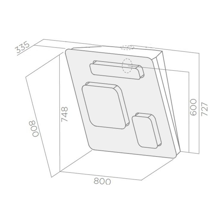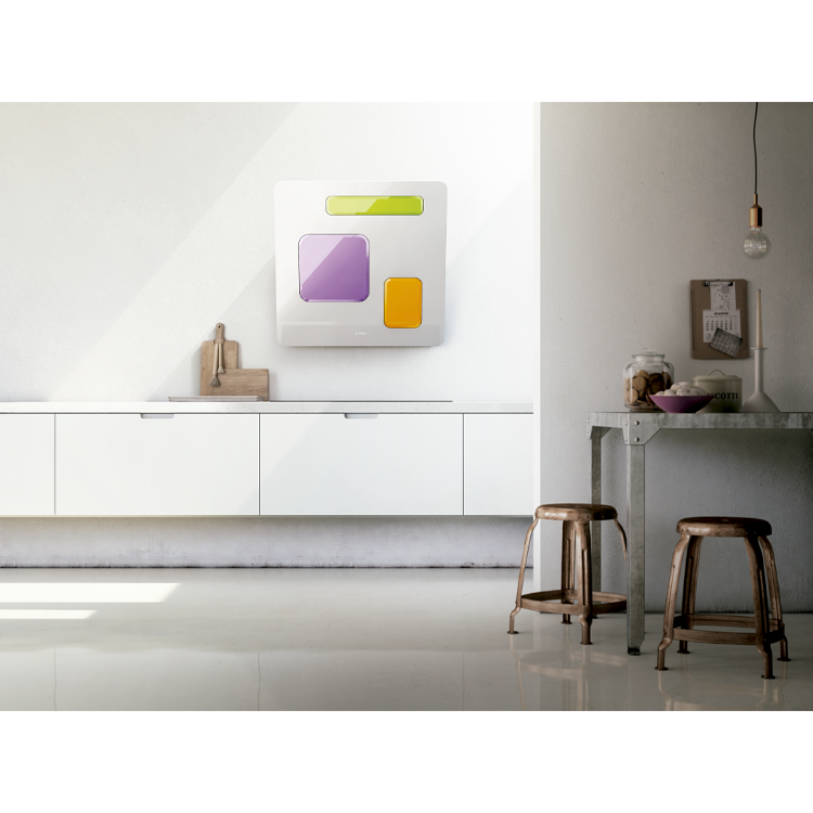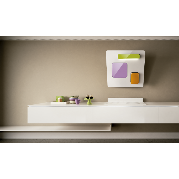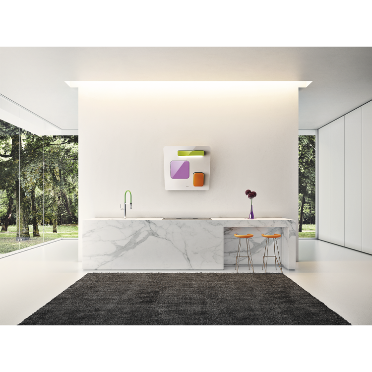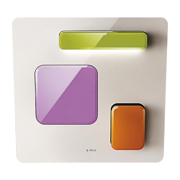 Da superfície quadrangular emergem três painéis em resposta às funções de aspiração e iluminação, criando uma composição equilibrada e divertida.
