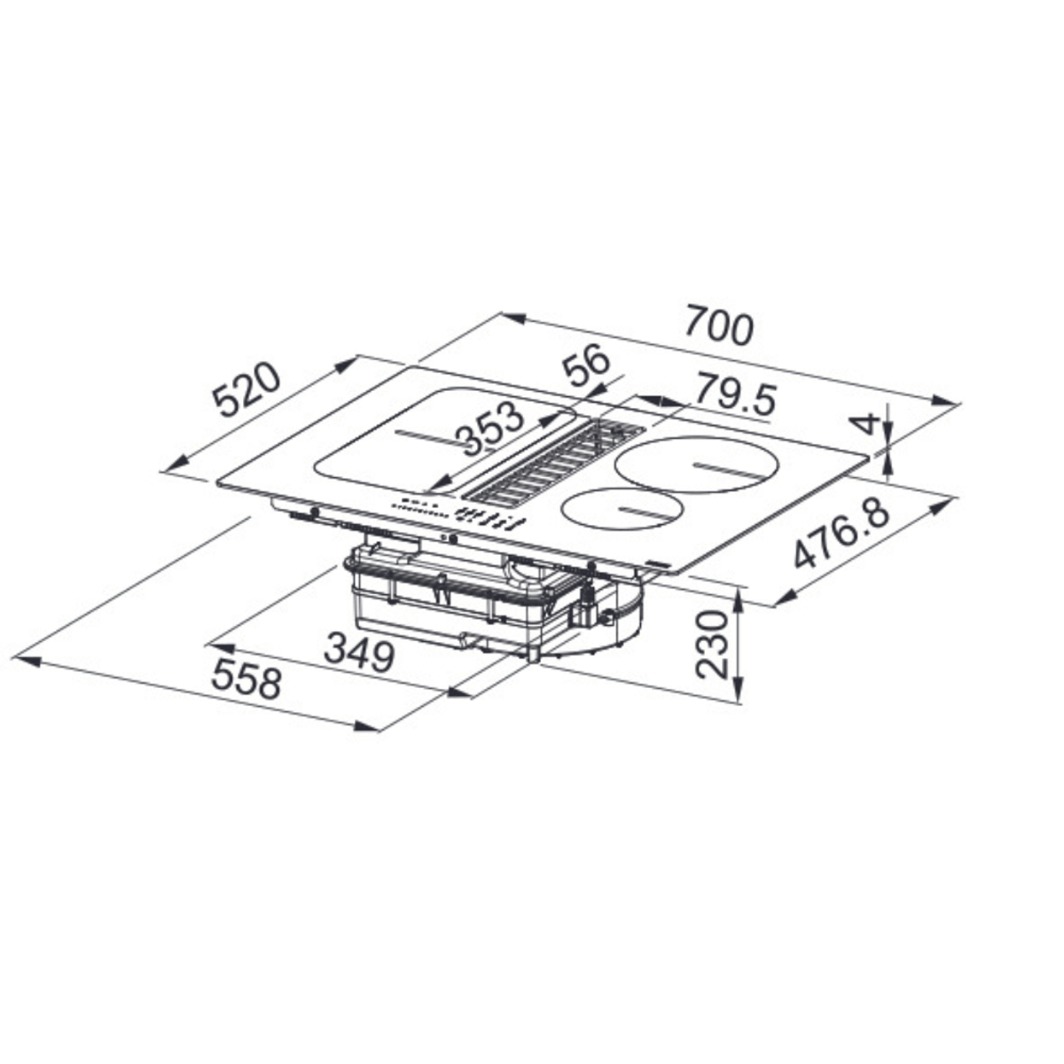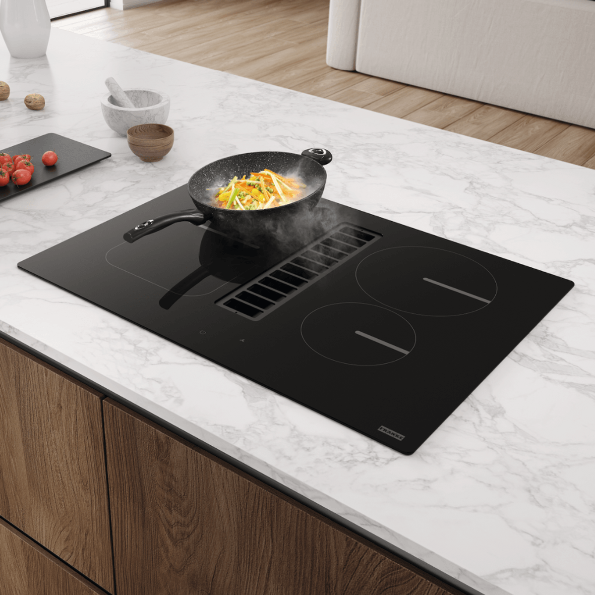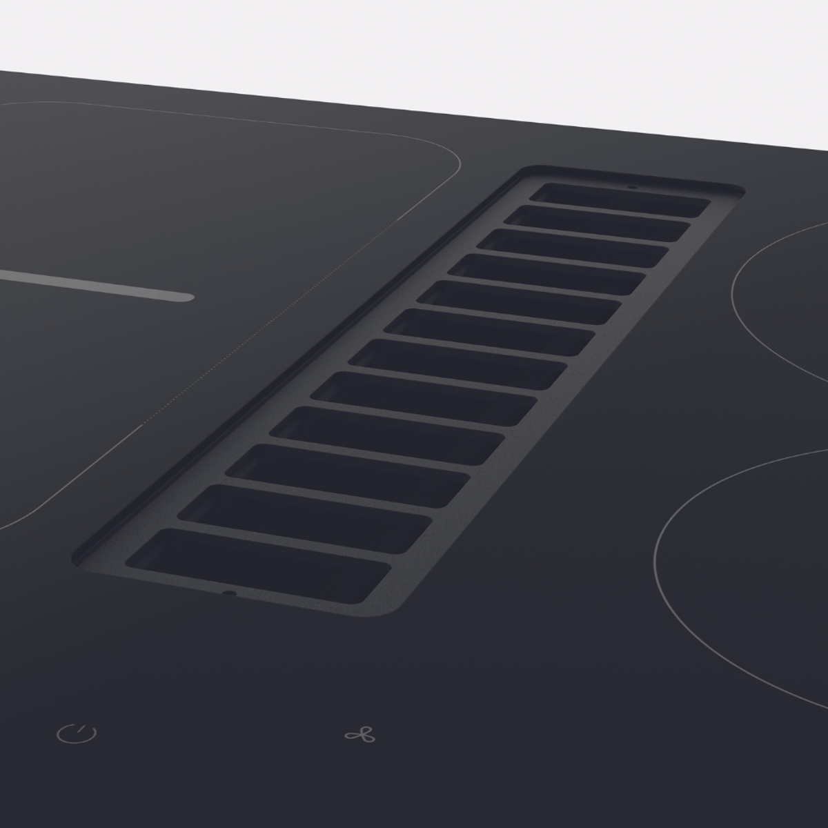 Todas as zonas do cooktop possuem 9 níveis de potência e função booster, totalizando 7400W, além de uma área flex. A coifa conta com extração máxima de 630m³/h (IEC), baixo ruído e é ativada automaticamente e na velocidade adequada e proporcional à potência escolhida do cooktop.