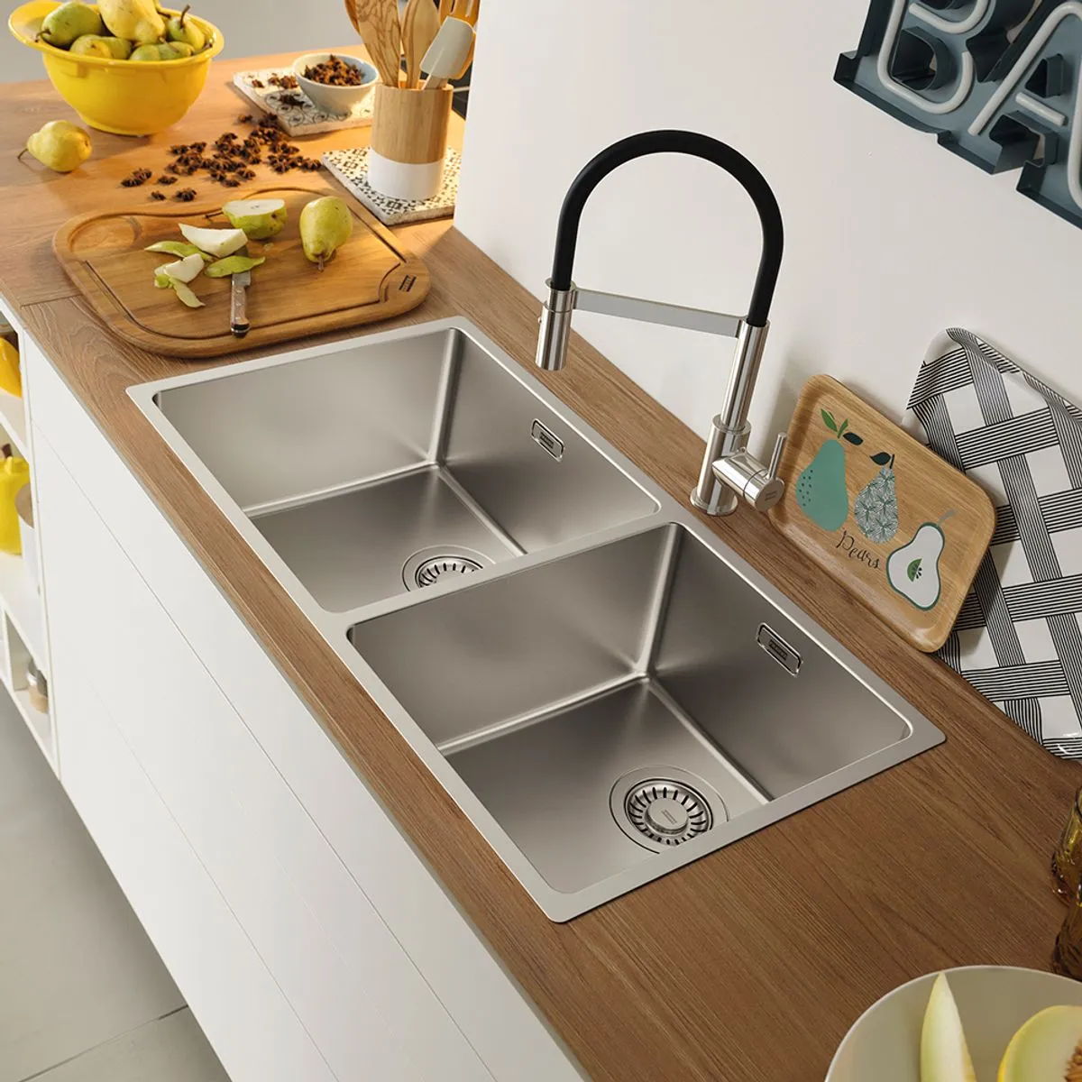 Devido ao sucesso dos tamanhos de 40, 50 e 60cm, a Franke apresenta a Cuba Linea Dupla, com e sem acessórios.