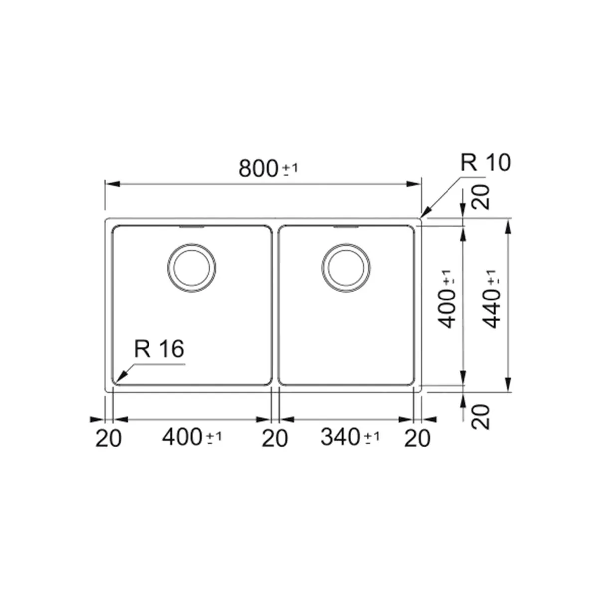 | Dimensão | Cuba maior: 400 mm x 400 mm, Cuba menor 340 mm x 400 mm |