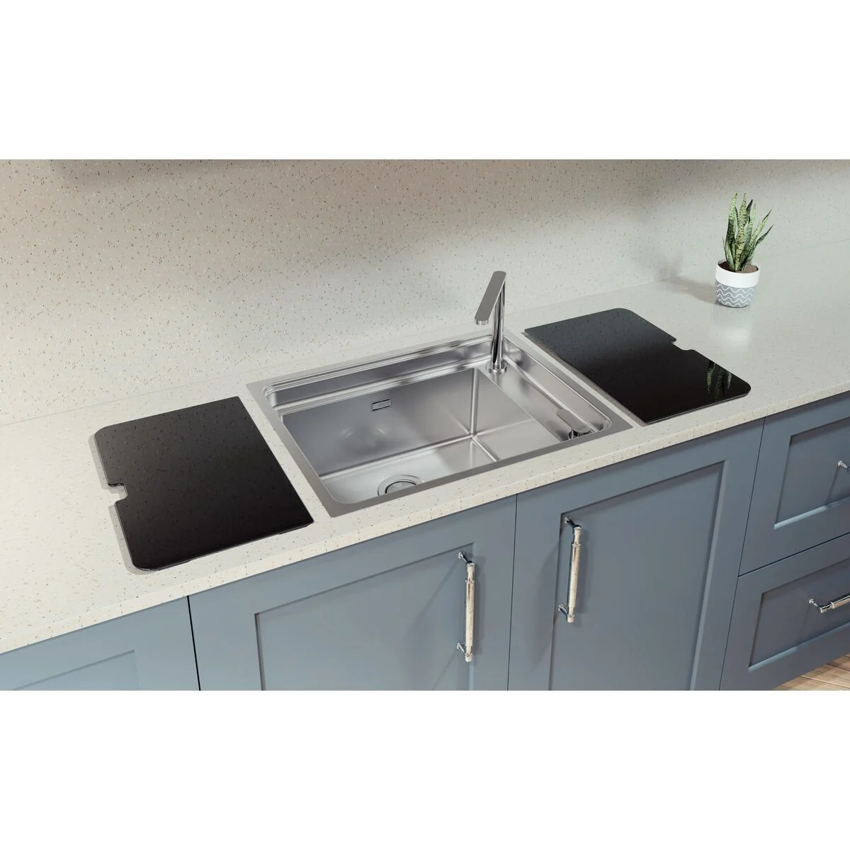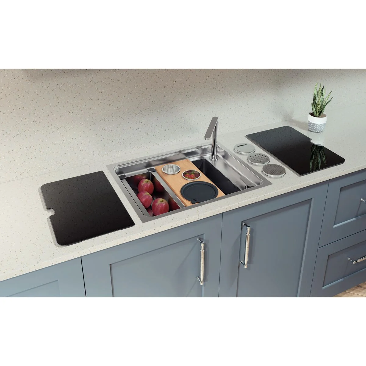 A cuba Tramontina Workstation Quadrum Deep 50 em aço inox com acessórios é mais um lançamento da linha Design Collection e deixará sua cozinha preparada para sua rotina diária, sem abrir mão da beleza e do estilo. Com uma variedade de acessórios, ela é uma cuba completa com misturador monocomando Hidden, válvula com escape, duas tábuas em vidro para seu fechamento, cesto coador, tábua em madeira com encaixe para bowl ralador e dois bowls auxiliares. Seu acabamento é Scotch Brite, o que garante um estilo diferenciado e maior durabilidade. A Cuba Workstation Quadrum Deep 50 pode ser instalada no modo semi-flush, por cima do granito ou no modo flush, que fica perfeitamente alinhada à bancada!