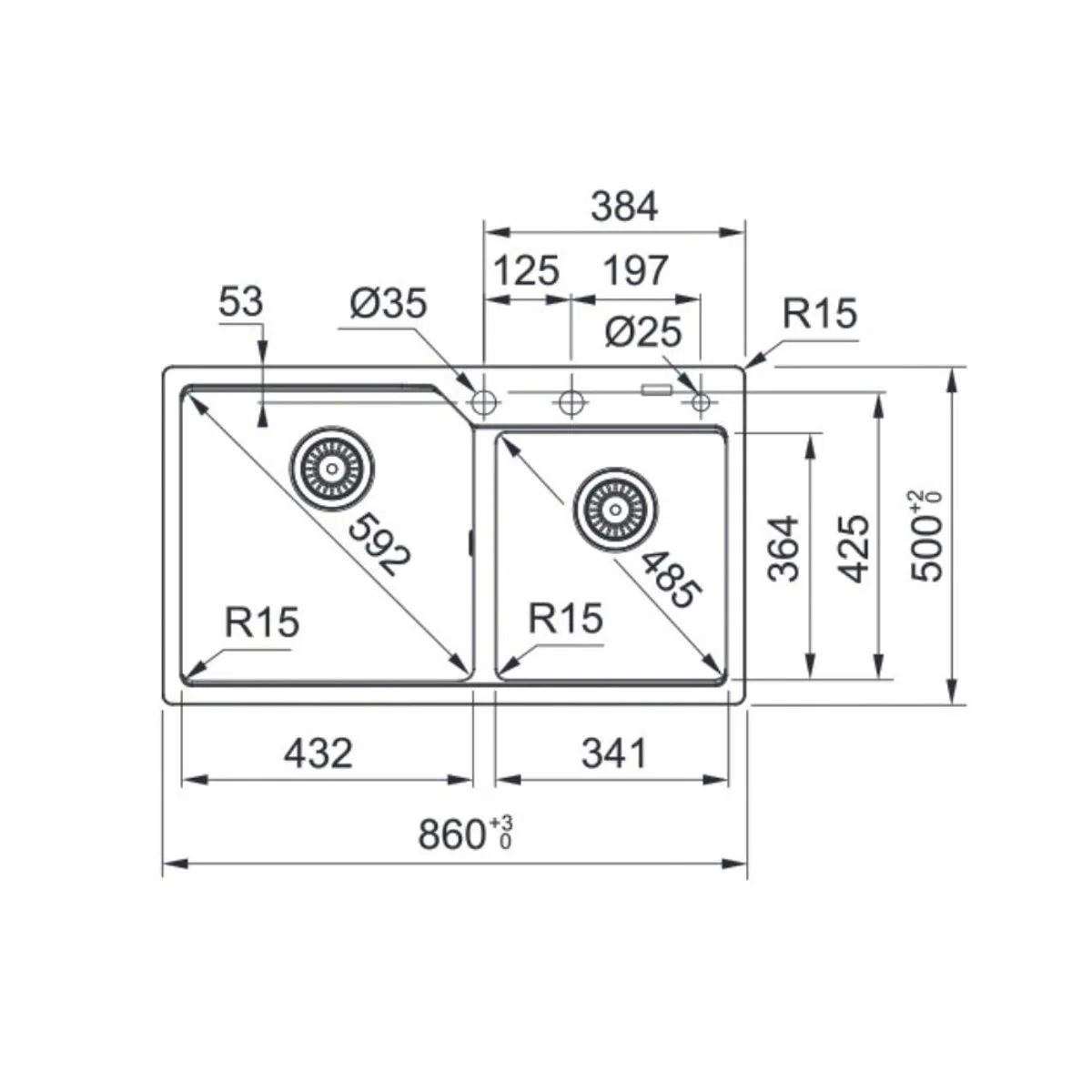 | Dimensional Interno (cm) | Cuba Dupla 43,2 x 42,5 e 34,1 x 36,4 |