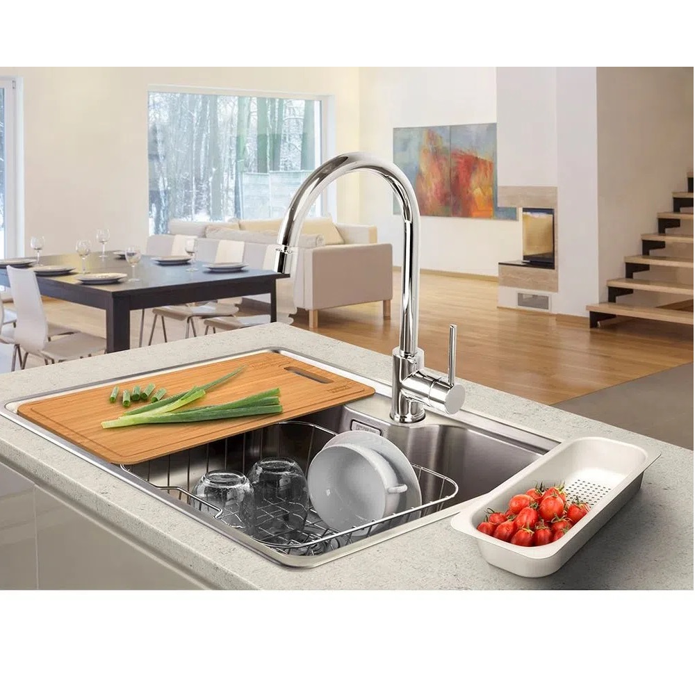 Acessórios que acompanham a cuba: Tábua de Madeira, Cesto Aramado e Dosador de Sabão.