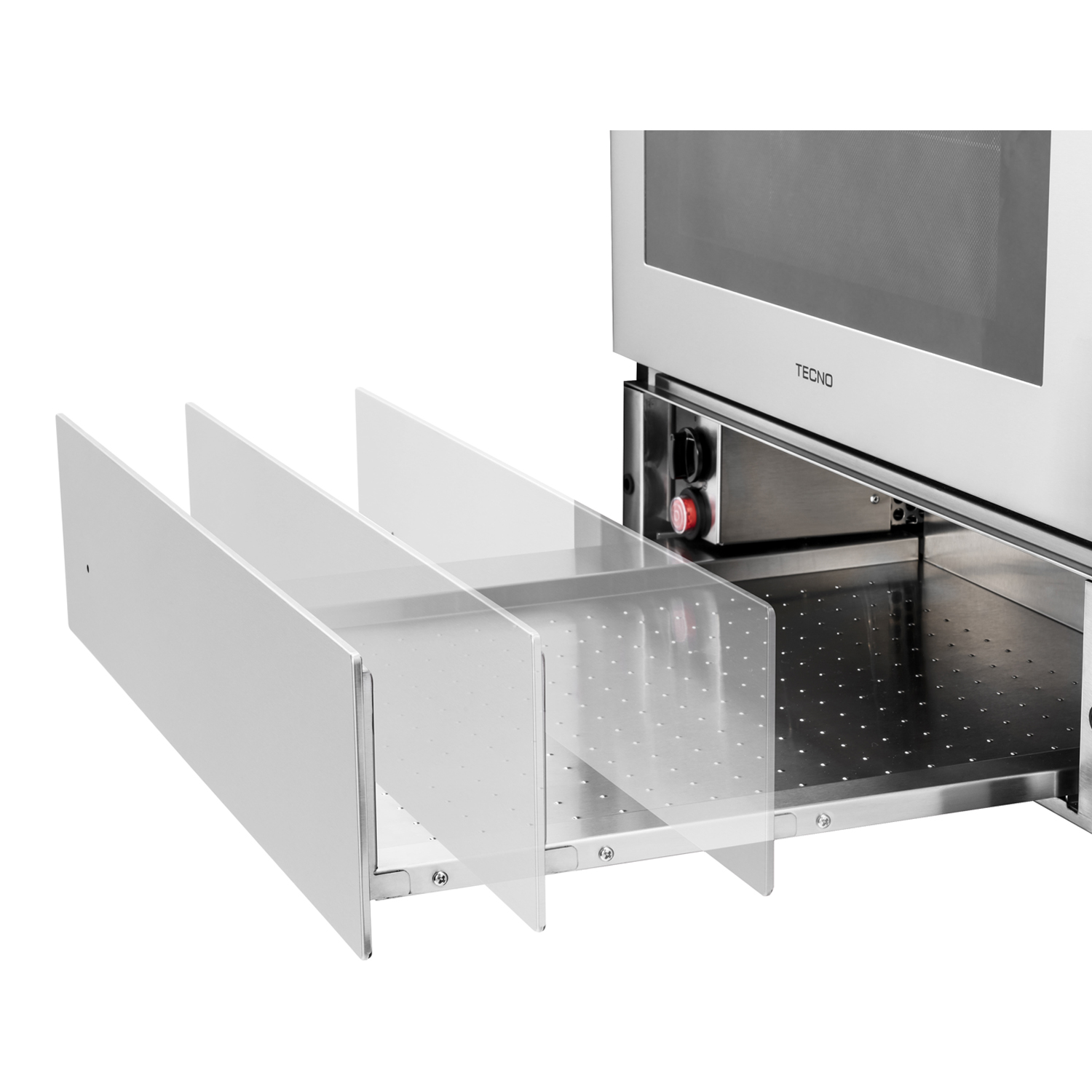 Gaveta sem laterais: Permite visualizar o interior e remover grandes travessas com facilidade e segurança.