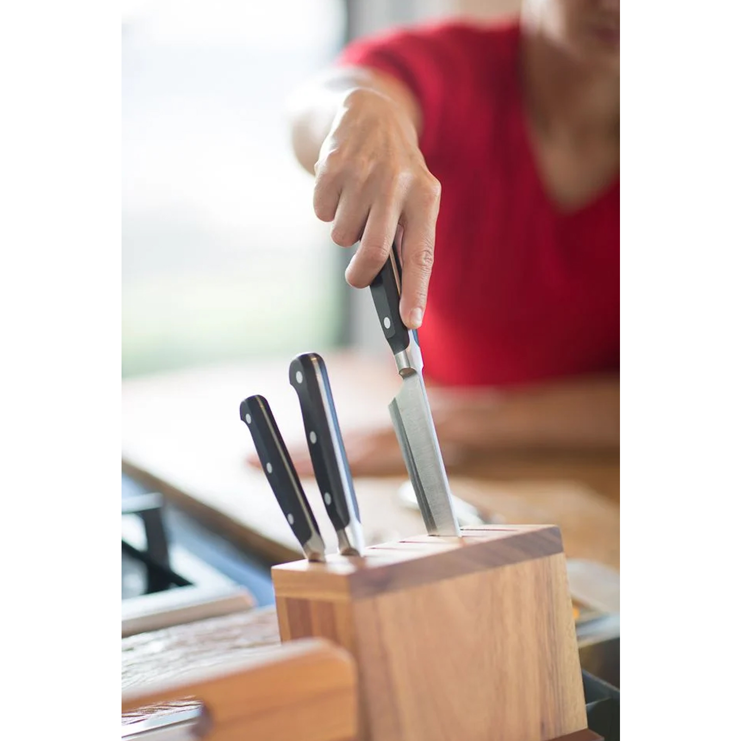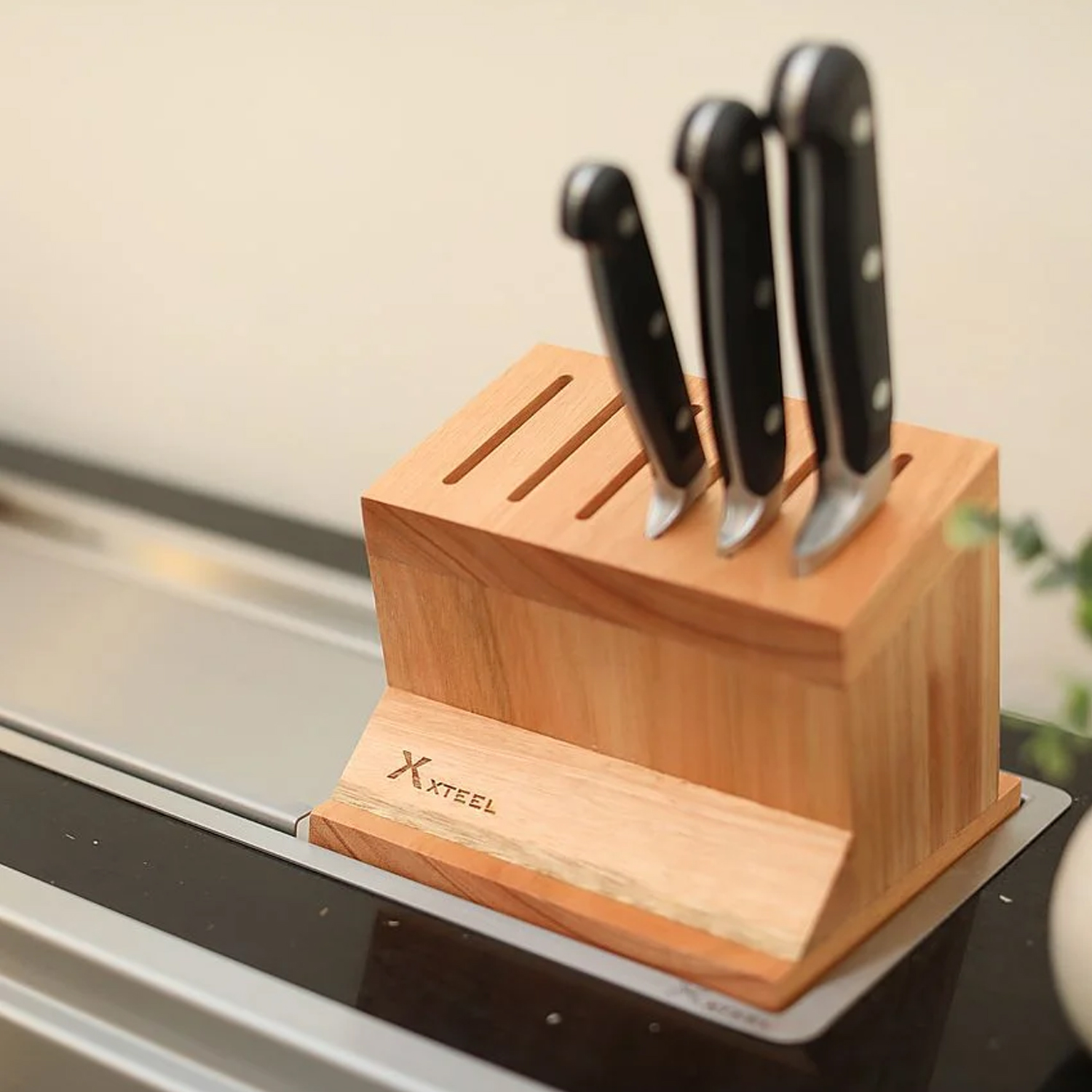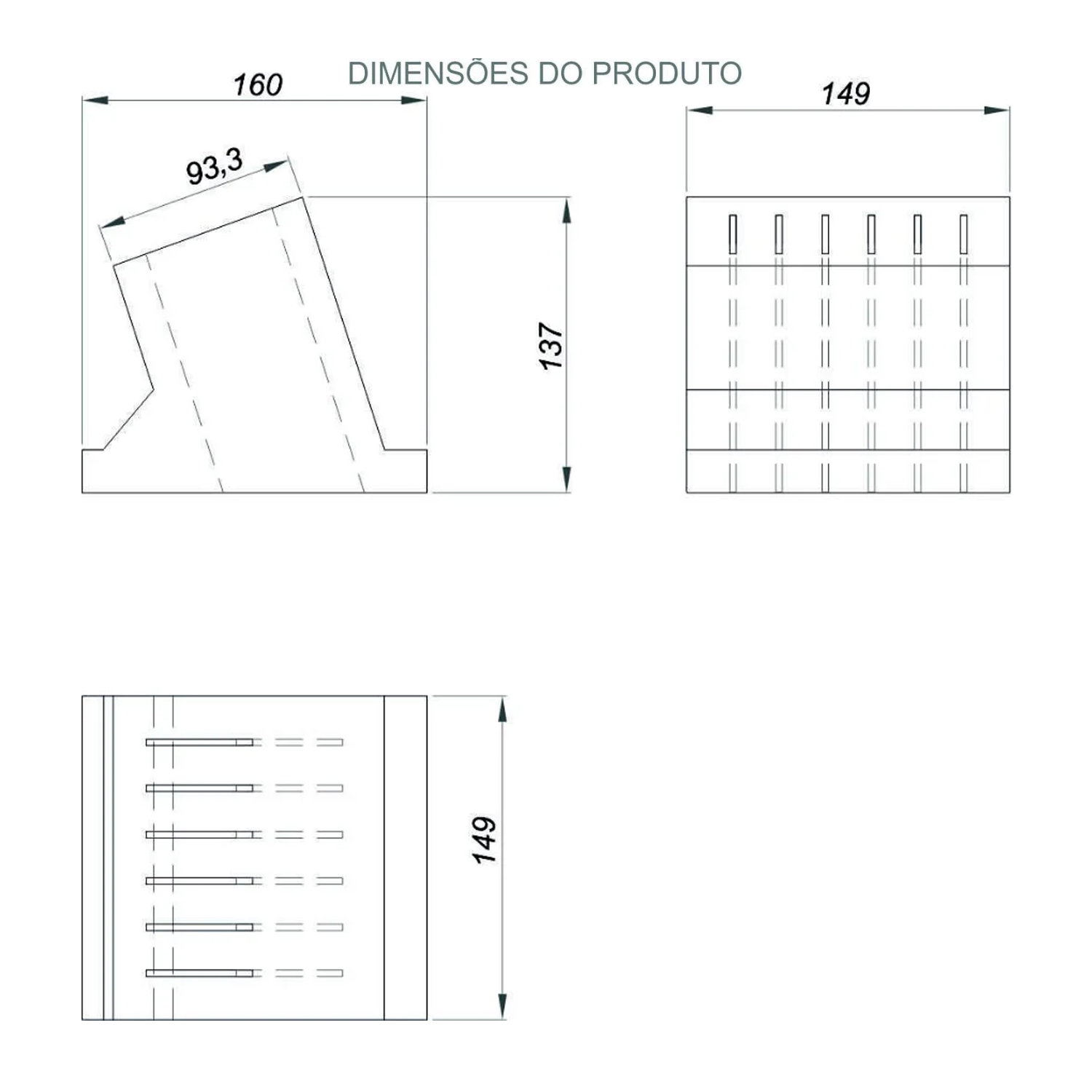 Este porta facas em madeira acondiciona, organiza e protege suas facas pois preserva o fio da lâmina. É produzido em madeira de reflorestamento e possui proteção antibacteriana, possui ainda formato que possibilita o uso tanto para facas curtas quanto para facas longas até 25 cm de comprimento. Acondiciona confortavelmente até 6 facas.
