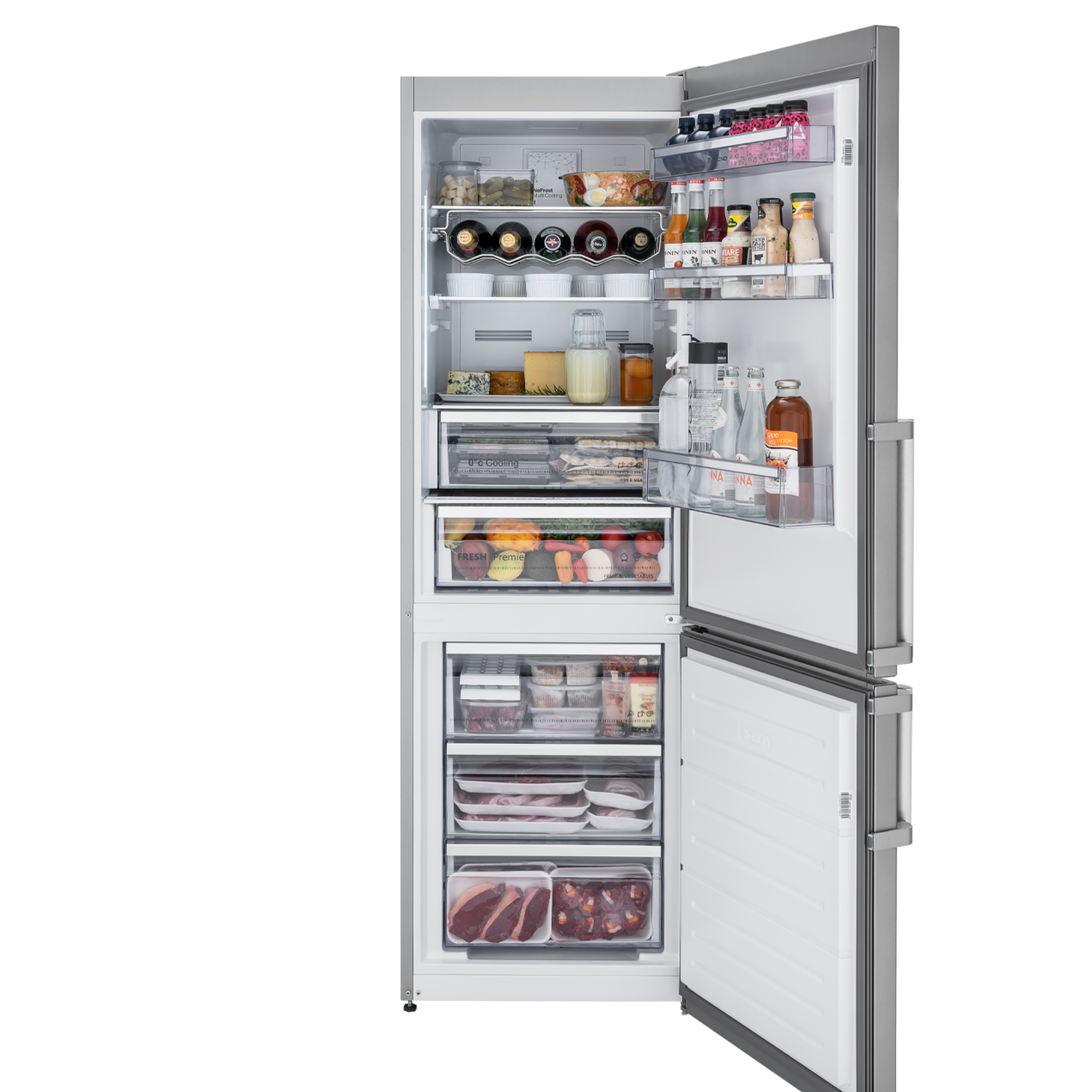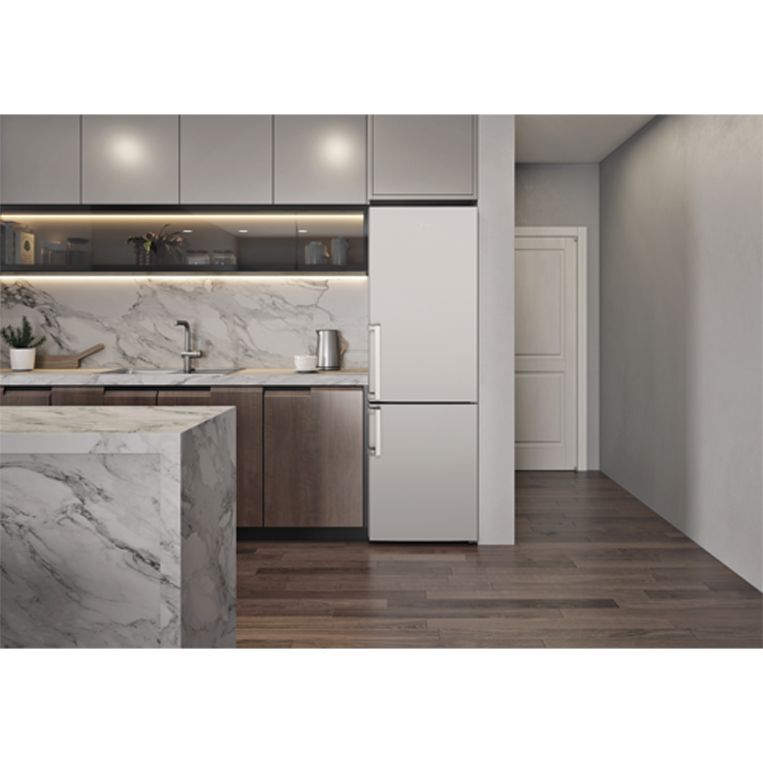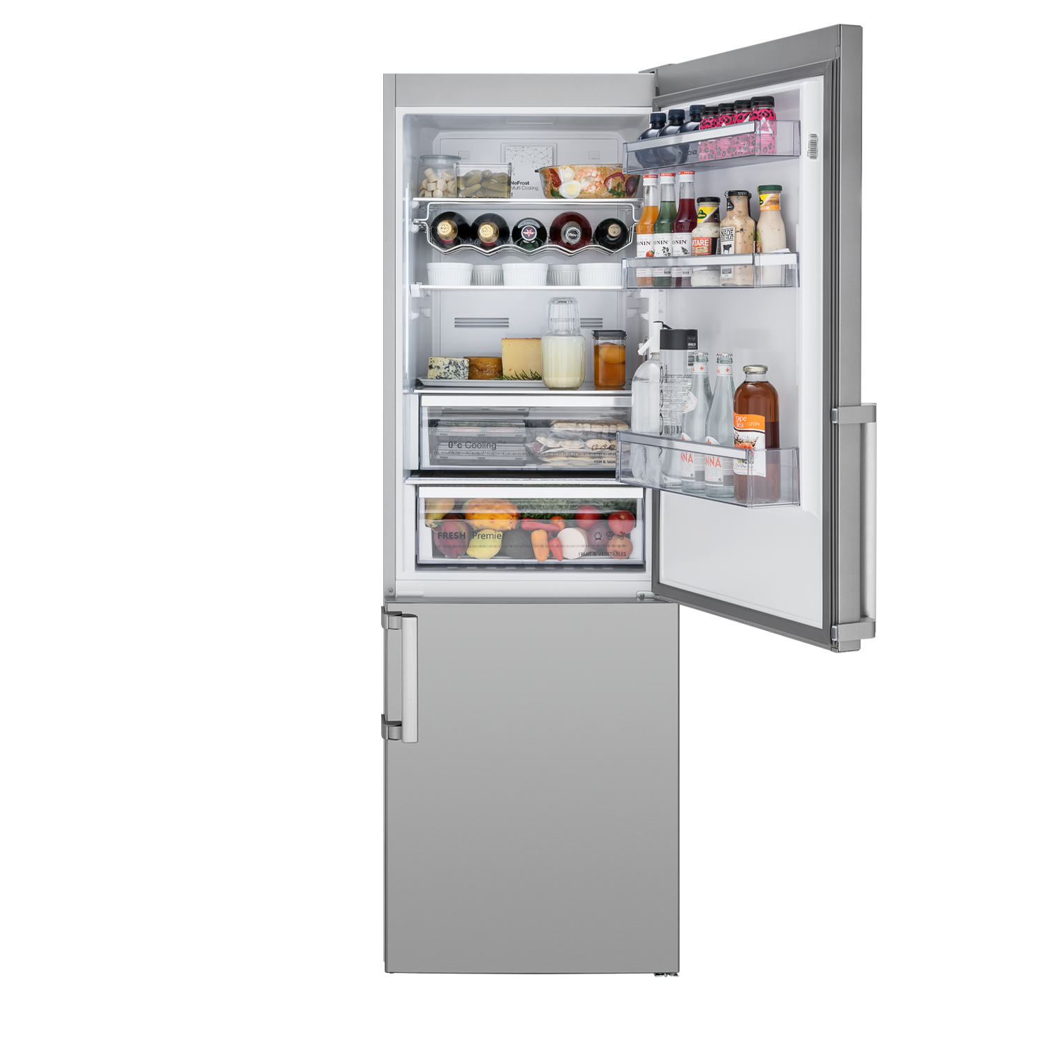 Modelo bottom freezer em aço inox anti-manchas com refinados puxadores que oferece uma perfeita integração no piso ou embutido nos móveis de sua cozinha planejada, sem necessitar de frestas de ventilação.
