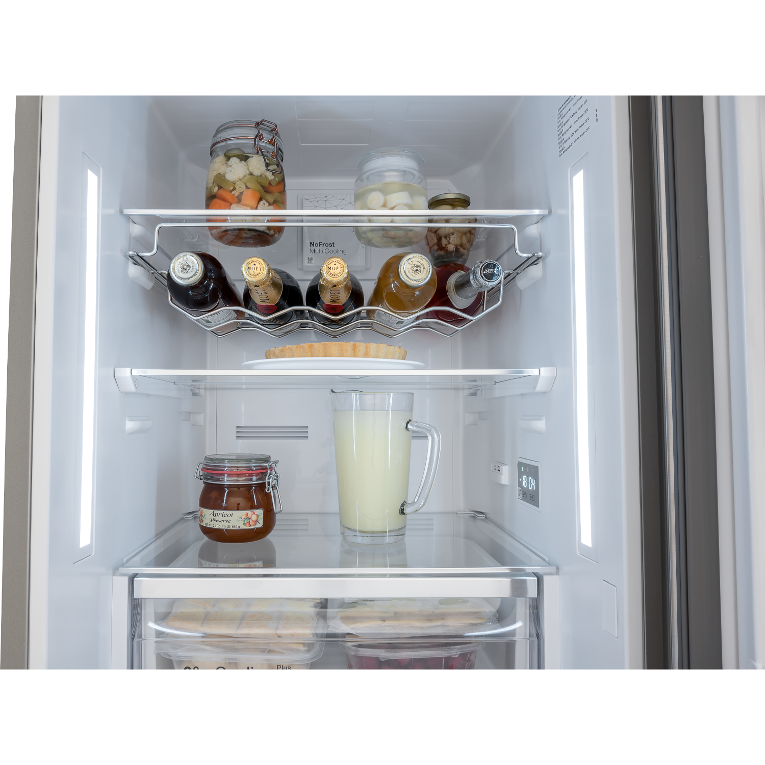 Um elegante rack de bebidas cromado armazena 5 grandes garrafas liberando mais espaço nas 3 prateleiras da porta em diferentes tamanhos.