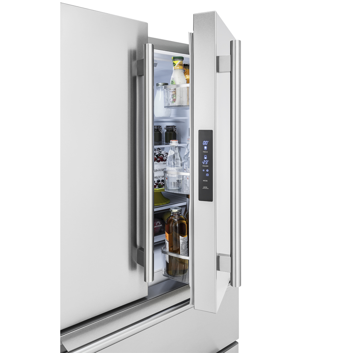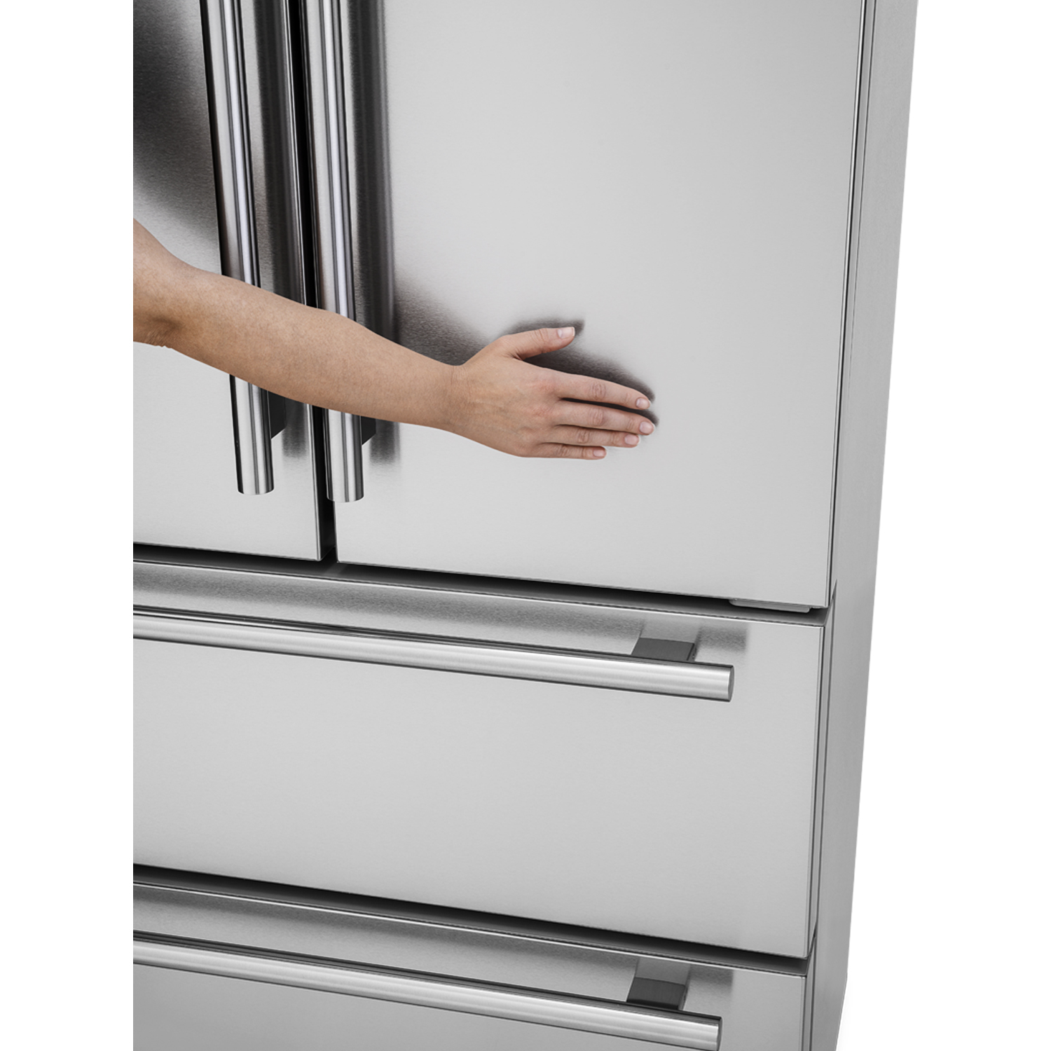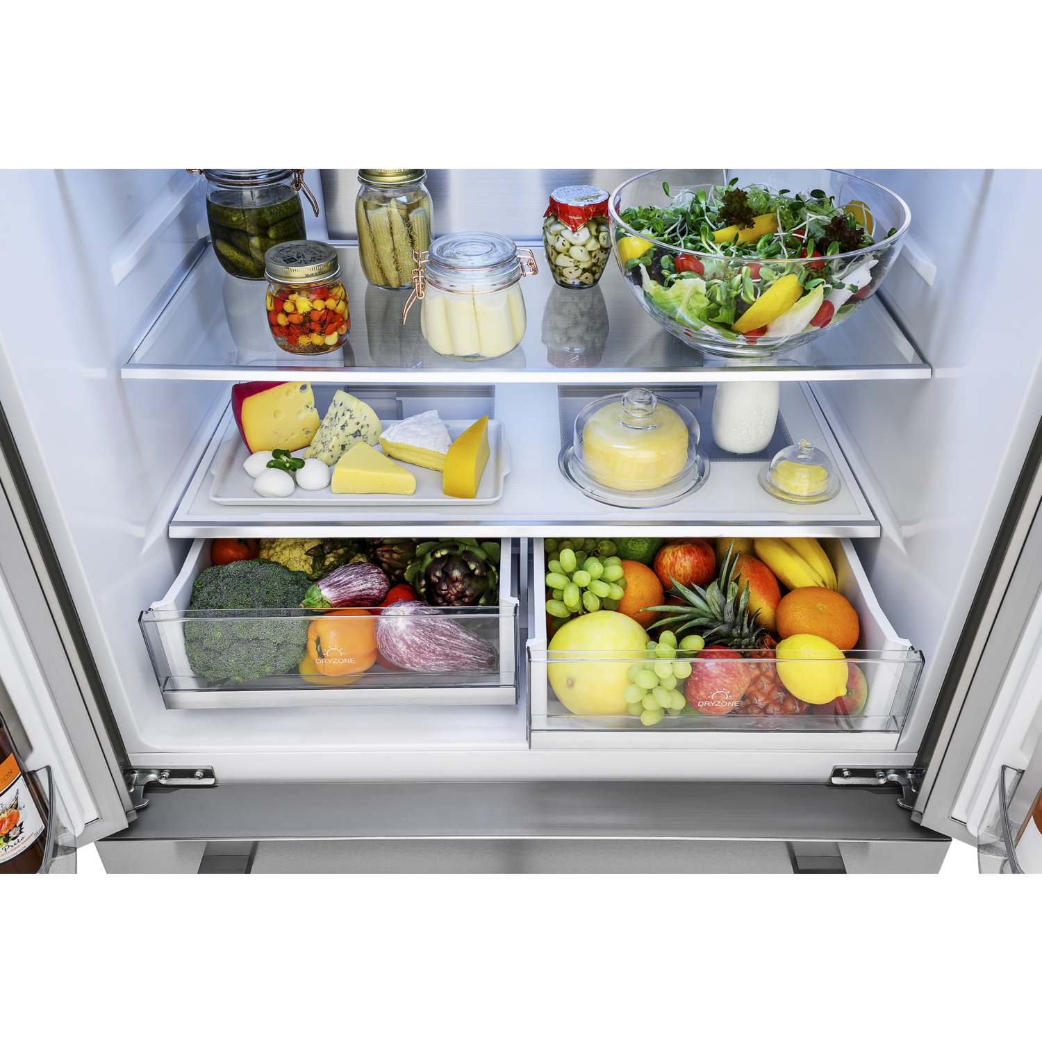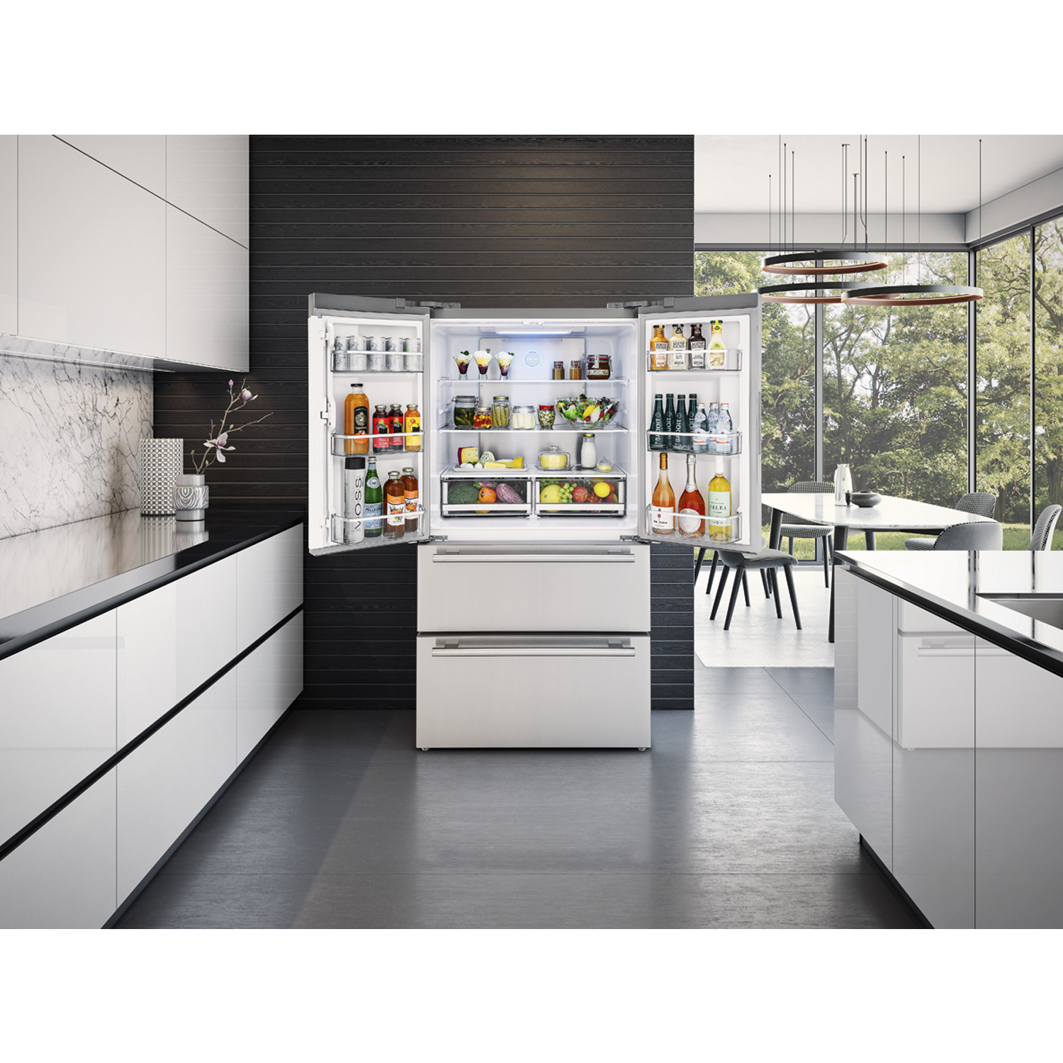Refrigerador french door em aço inox escovado anti-manchas com robustos puxadores tubulares para aplicação no piso ou embutido em sua cozinha planejada sem frestas de ventilação.