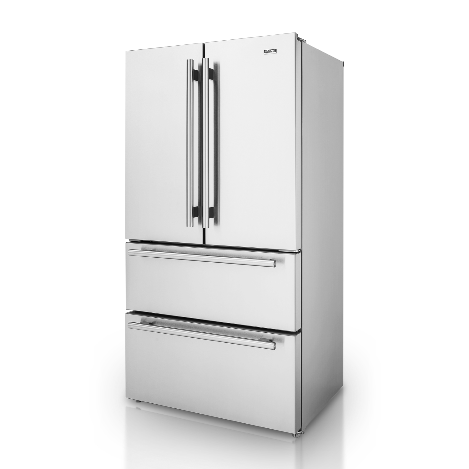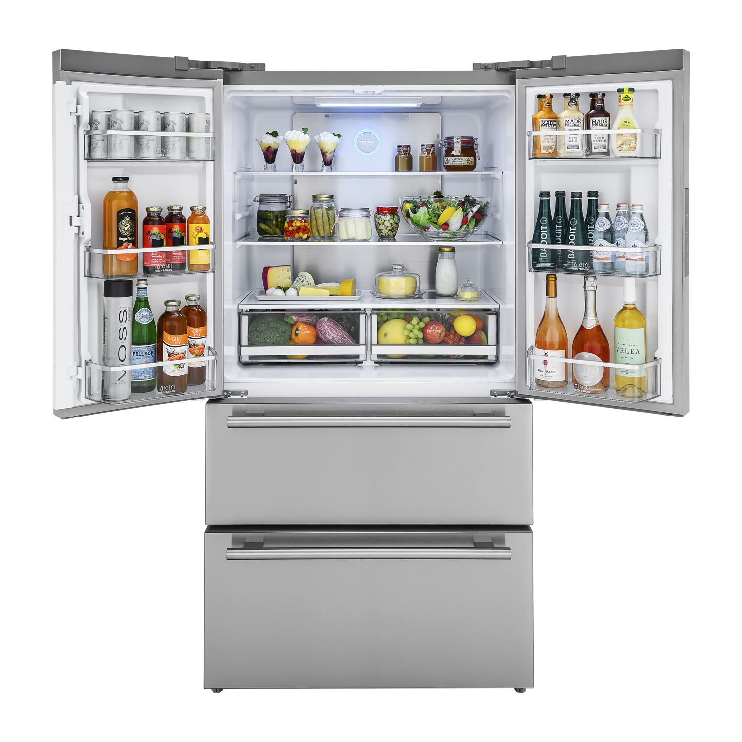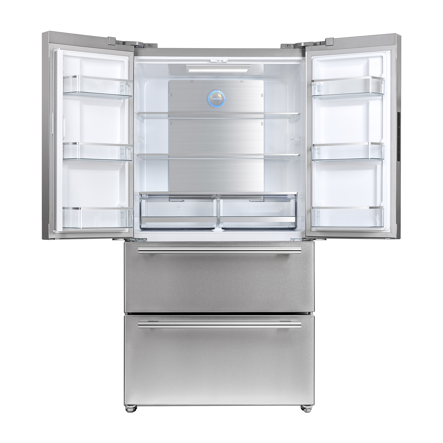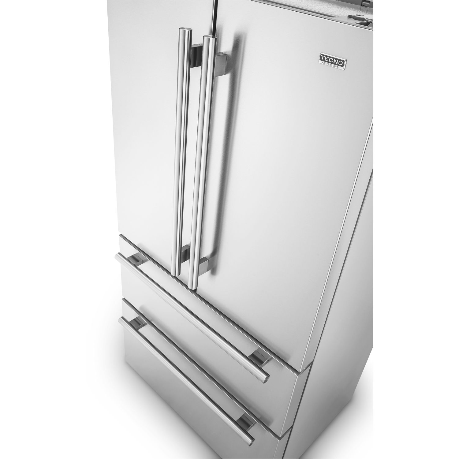 Refrigerador french door em aço inox escovado anti-manchas com robustos puxadores tubulares para aplicação no piso ou embutido em sua cozinha planejada sem frestas de ventilação.
