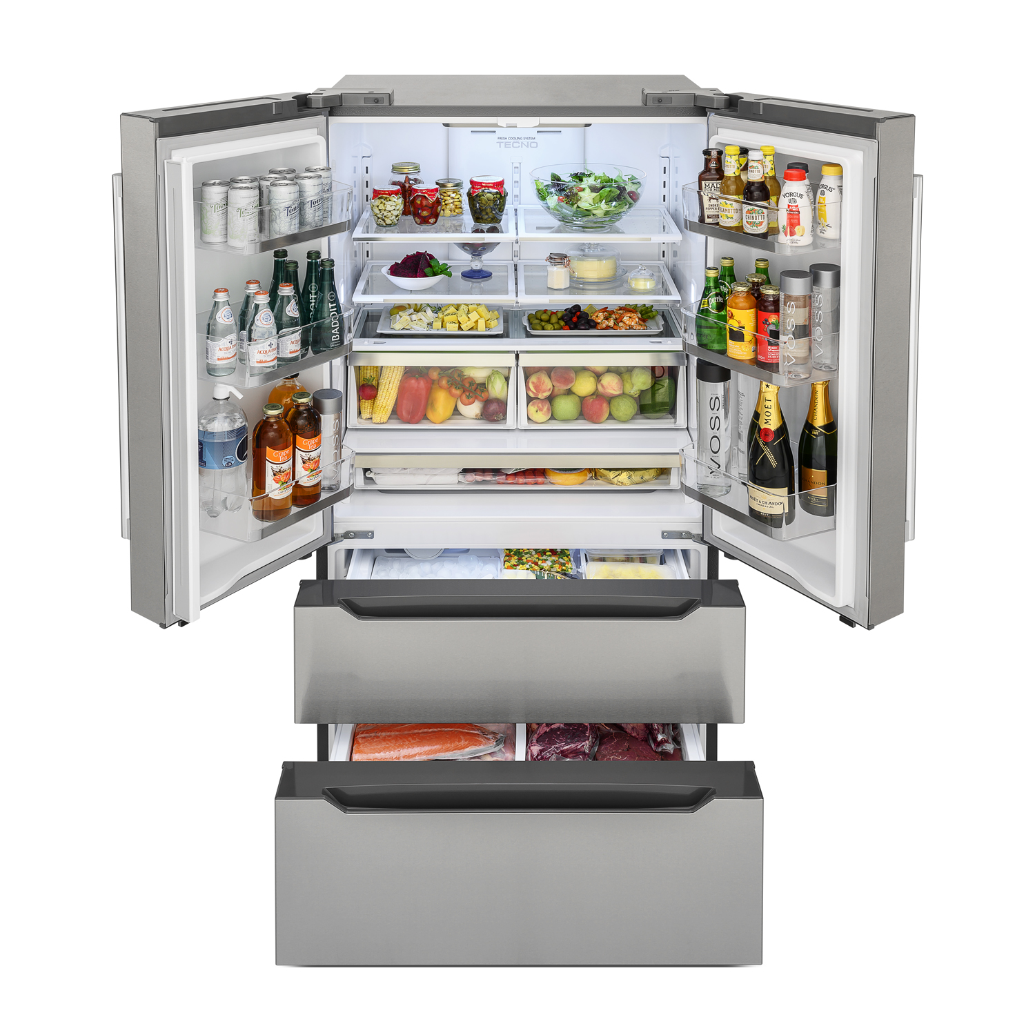 Em suas portas estão disponíveis prateleiras de diferentes tamanhos para grandes recipientes, bebidas e molhos.