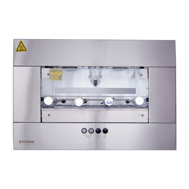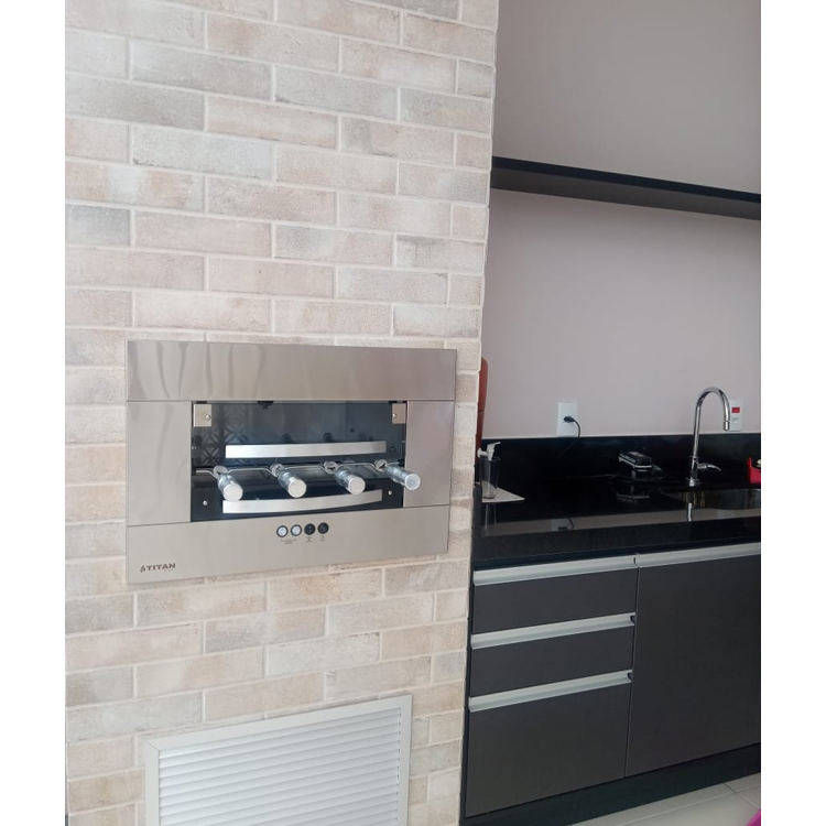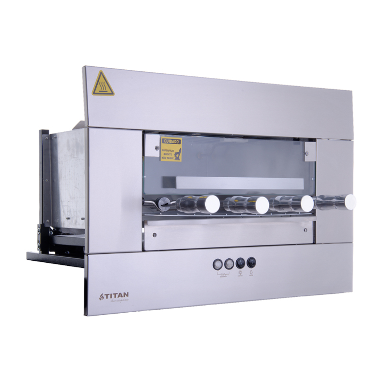 Churrasqueira elétrica Titan para EMBUTIR em nicho de alvenaria, seu espaço gourmet mais moderno e prático. É ideal para assar Carnes, Legumes e garantir um saboroso Churrasco. Possui sistema rotativo, iluminação interna e duas resistências elétricas. Churrasqueira silenciosa e não produz fumaça.